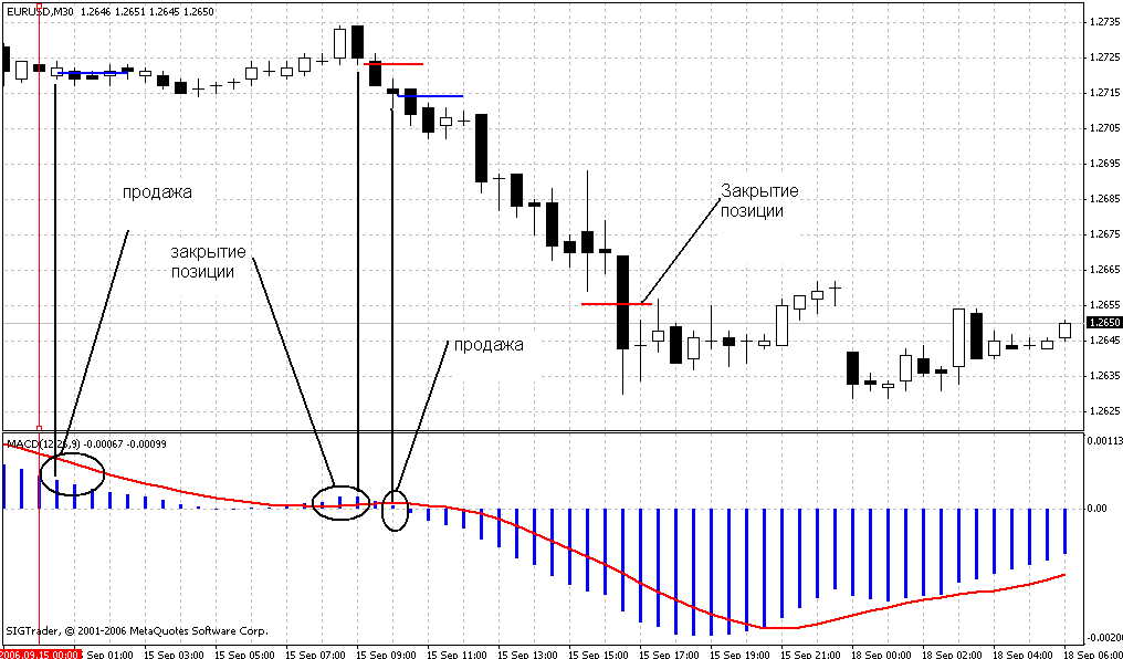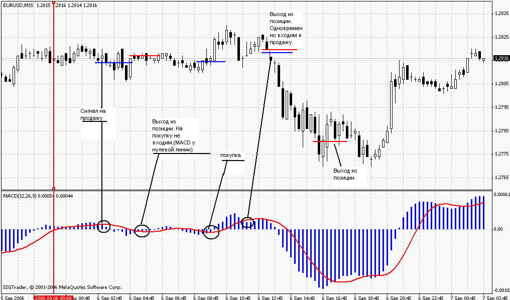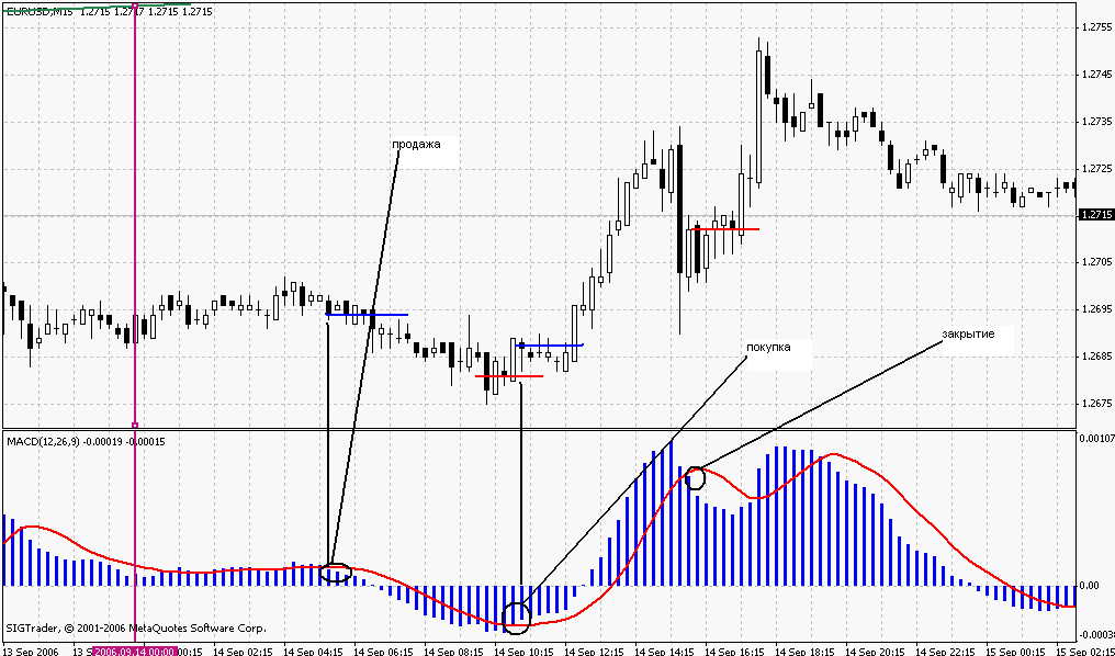 | Торговля на М30 за 15 сентября. Калькуляция: первый трейд -6 пунктов, второй трейд +55 пунктов.